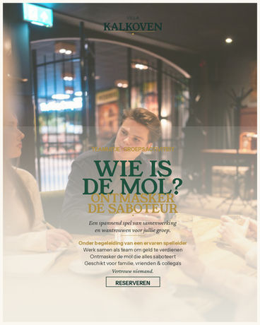 Onder begeleiding van een ervaren spelleider worden familie, vrienden of collega's verdachten tijdens het spannende spel Wie is de Mol?. Werk samen als team om zoveel mogelijk geld te verdienen, terwijl je de mol probeert te ontmaskeren. Deze gezellige, maar strategische activiteit combineert samenwerking en wantrouwen. Vertrouw niemand, want één van jullie is de saboteur die alles op het spel zet om jullie te dwarsbomen!